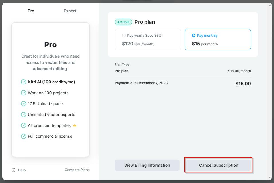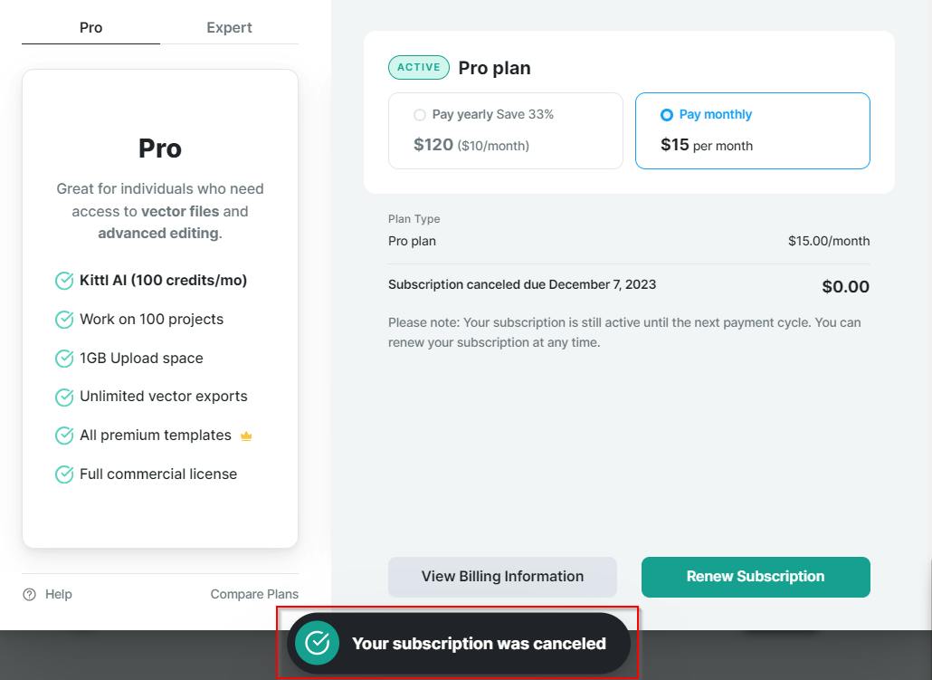 Your subscription will be canceled after your current billing period. You'll still have access to Kittl Pro or Expert features until then. Please note that Kittl plans are non-refundable.