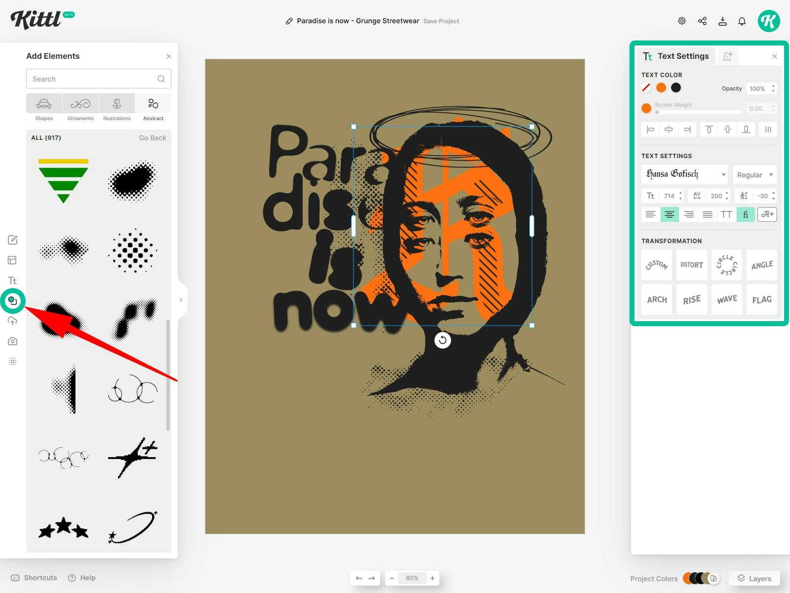 Vector elements in your Y2K hoodie grunge design will add shading and visuals that nobody can miss. You can select these elements from the "Abstract" section. For our example, we also inserted a massive-size orange letter from the Hansa font and placed it behind the illustration.